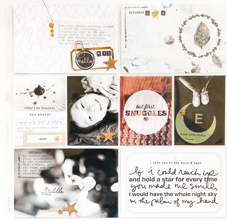 Next up is Patricia. She pulled out the neutrals in this month kit along with some gorgeous B&W photos and made excellent use of those Crate Paper rub-ons. They really make a lovely statement when placed directly onto her photos.