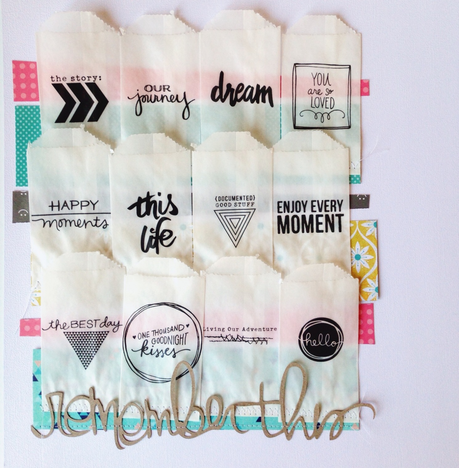 Instead of making resolutions and goals this year, because we all know well we do with those(!), I decided that the first page in my 2015 layout album (I also have a PL album) would be this page. I used 12 vellum envelopes from my stash and embellished them with the Crate Paper rub-ons and then layered them on strips of pp from the kit. Throughout the year I can write down memories, accomplishments etc. tuck them in the envelopes and at the end of the year I think it will be fun to read everything that was written down. We are (hopefully) completing our second adoption this year so there will be lots of moments I don’t want to forget!