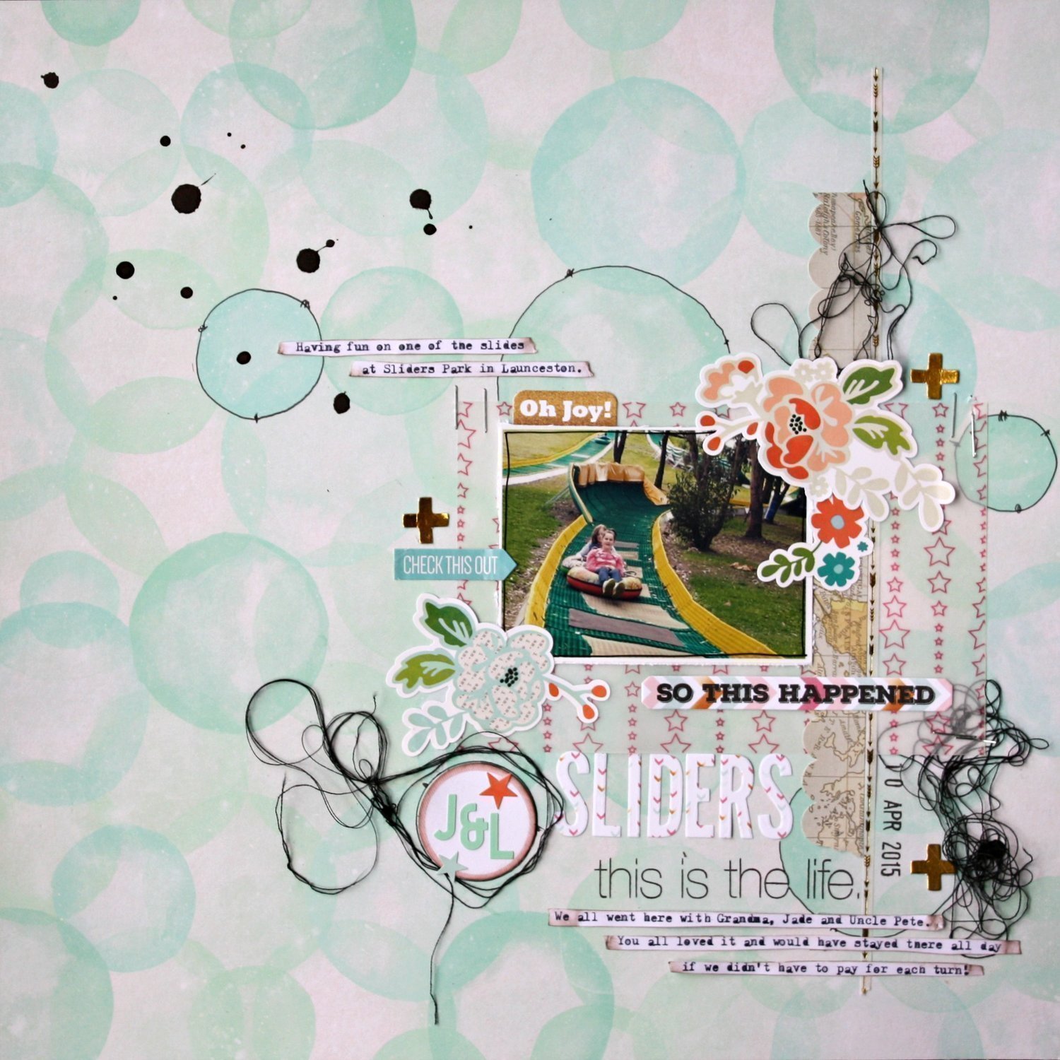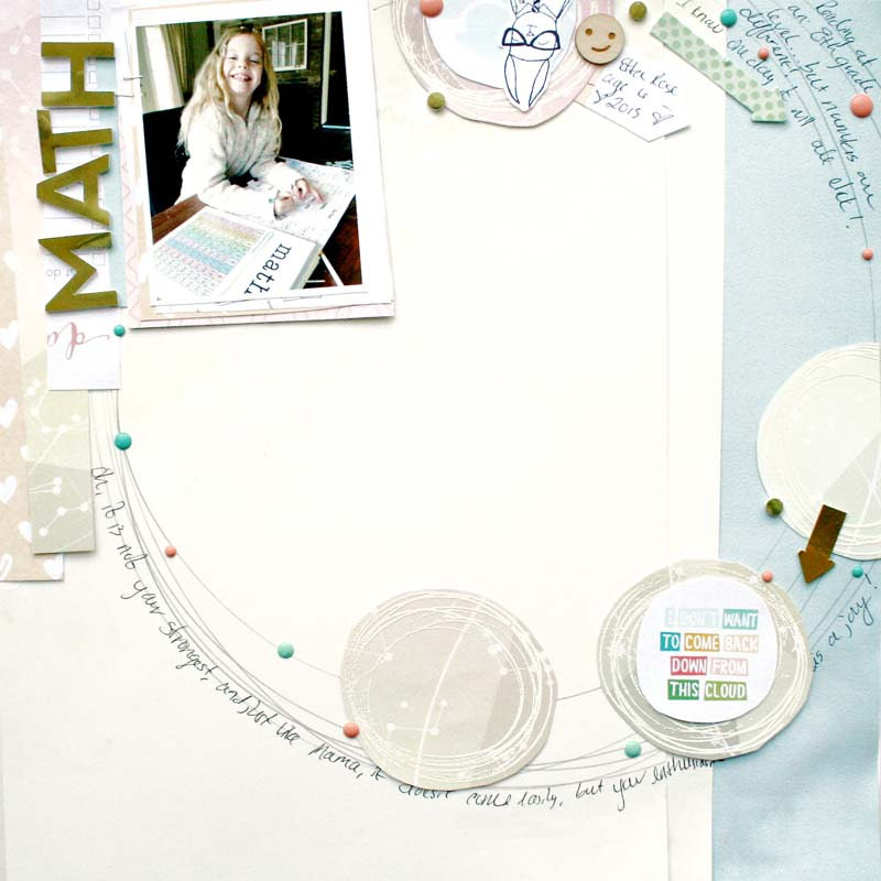 A layout where she embossed the circle and, cut it out a number of times (she also snuck in Simon!).