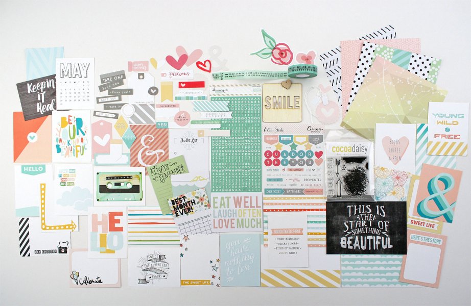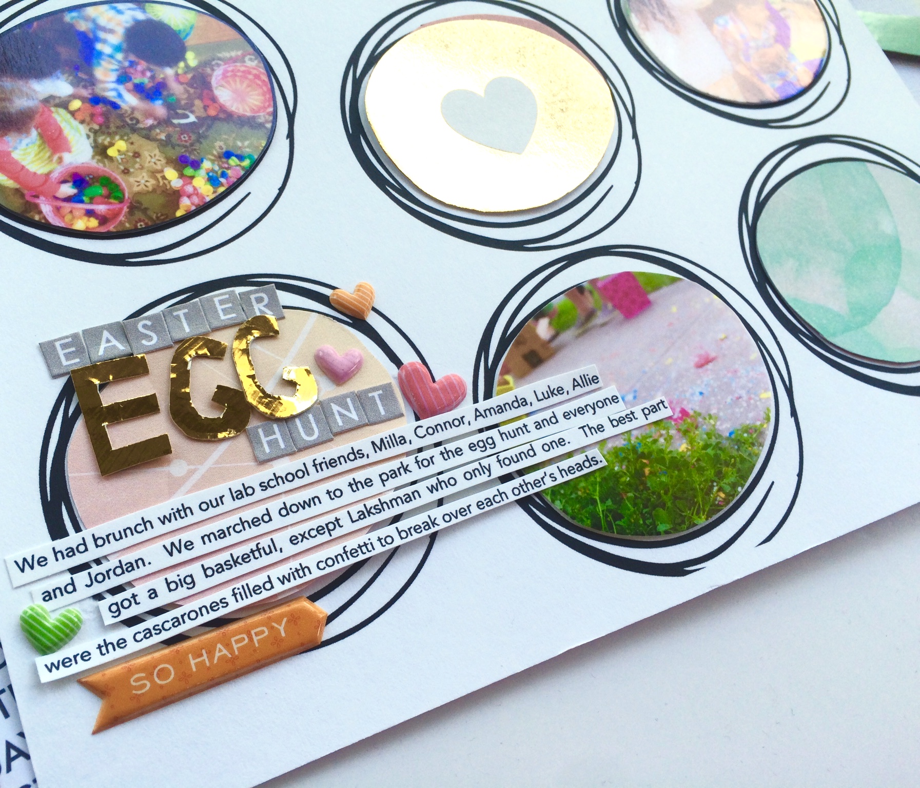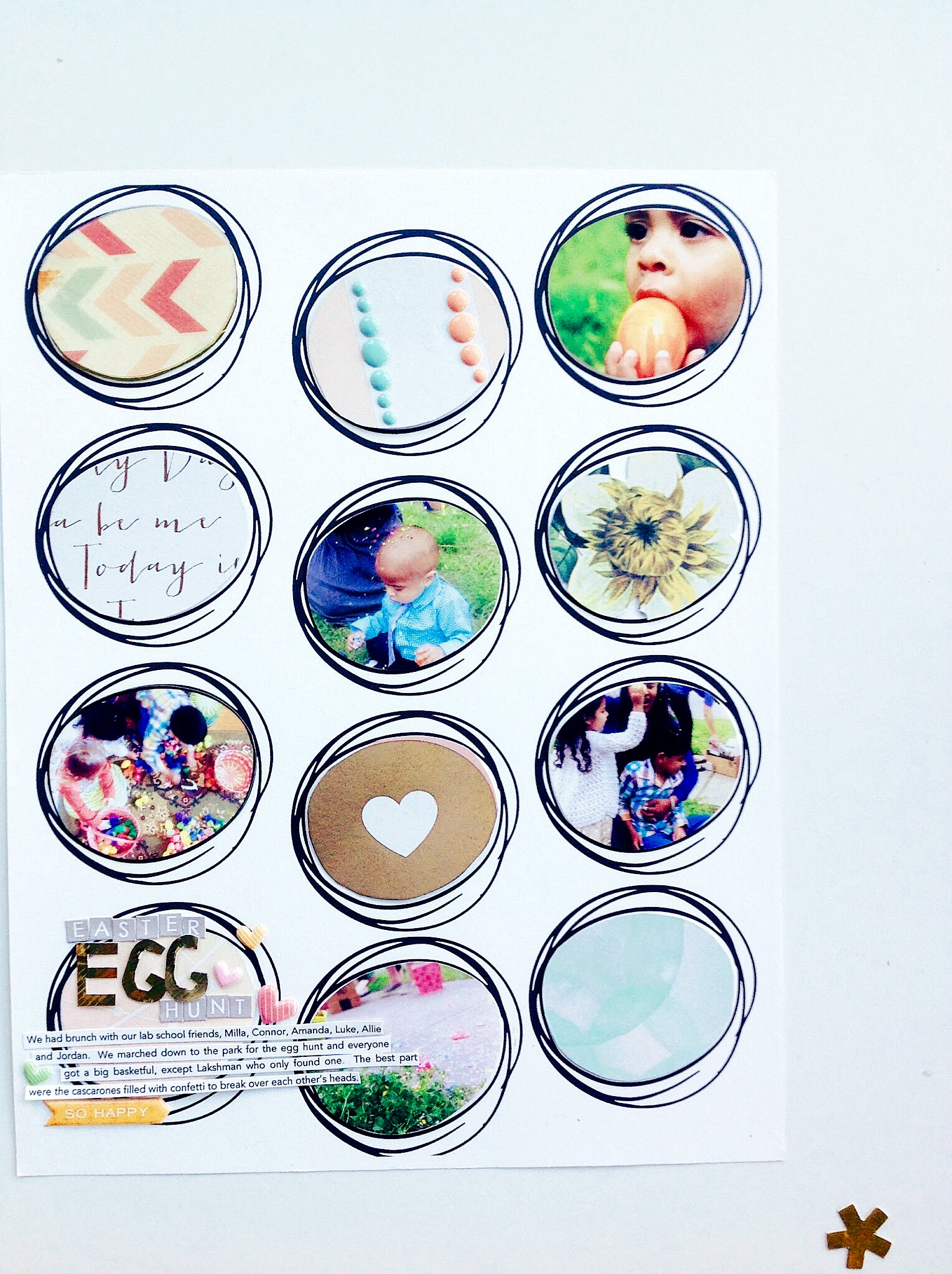 I love to use a grid as a starting point for a page.  When I saw the scribbled circle stamp designed by Ashli I knew it would be a great base for a page, and a nice variation of a typical square or circle grid.  To get a nicely repeating grid with the stamp I used the digital version in photo shop and printed it out on cardstock.  I traced the inside of the scribbled circle and cut out several photographs and patterned papers to fill my stamped shapes.  I added a few irregular pieces, like the gold speech bubble and the flower, that didn’t fully fit the circle.  In keeping with the fun handmade feeling of the stamp, I hand cut some of my title from the gold chevron paper.  This stamp ended up being a perfect match for all of my Easter pictures that were just waiting to be scrapped!