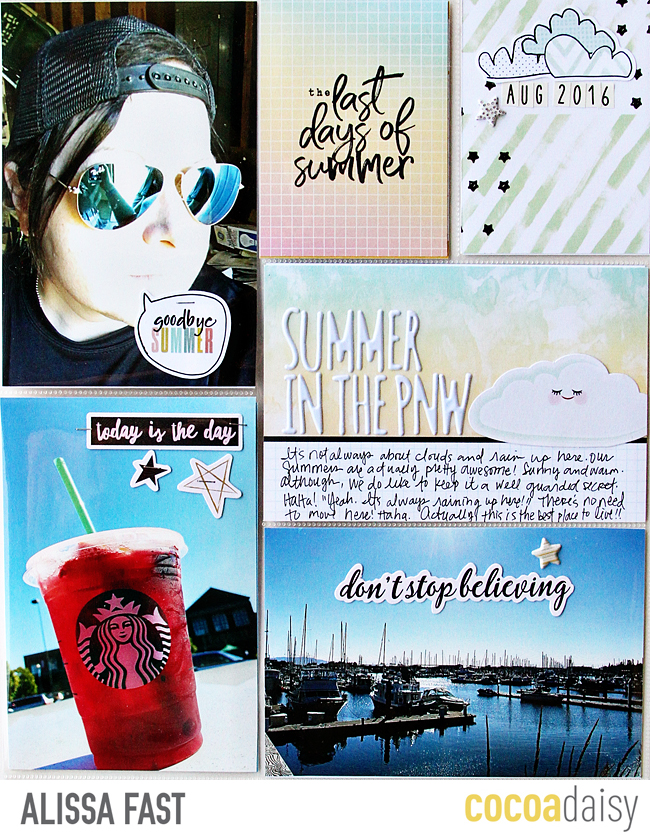 Last up is my page. I used that same journal card as Suz, for my title, but I covered up the bird with a cloud, to better fit my theme. If the images just don;t quite work with your page, use die cuts or other elements to make it your own.