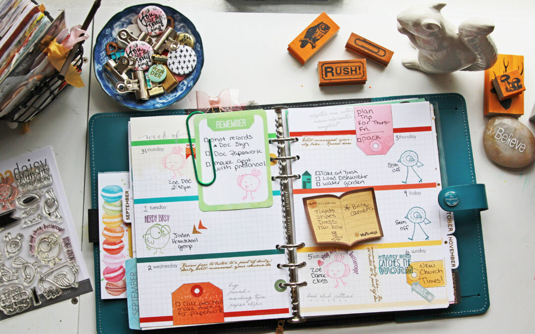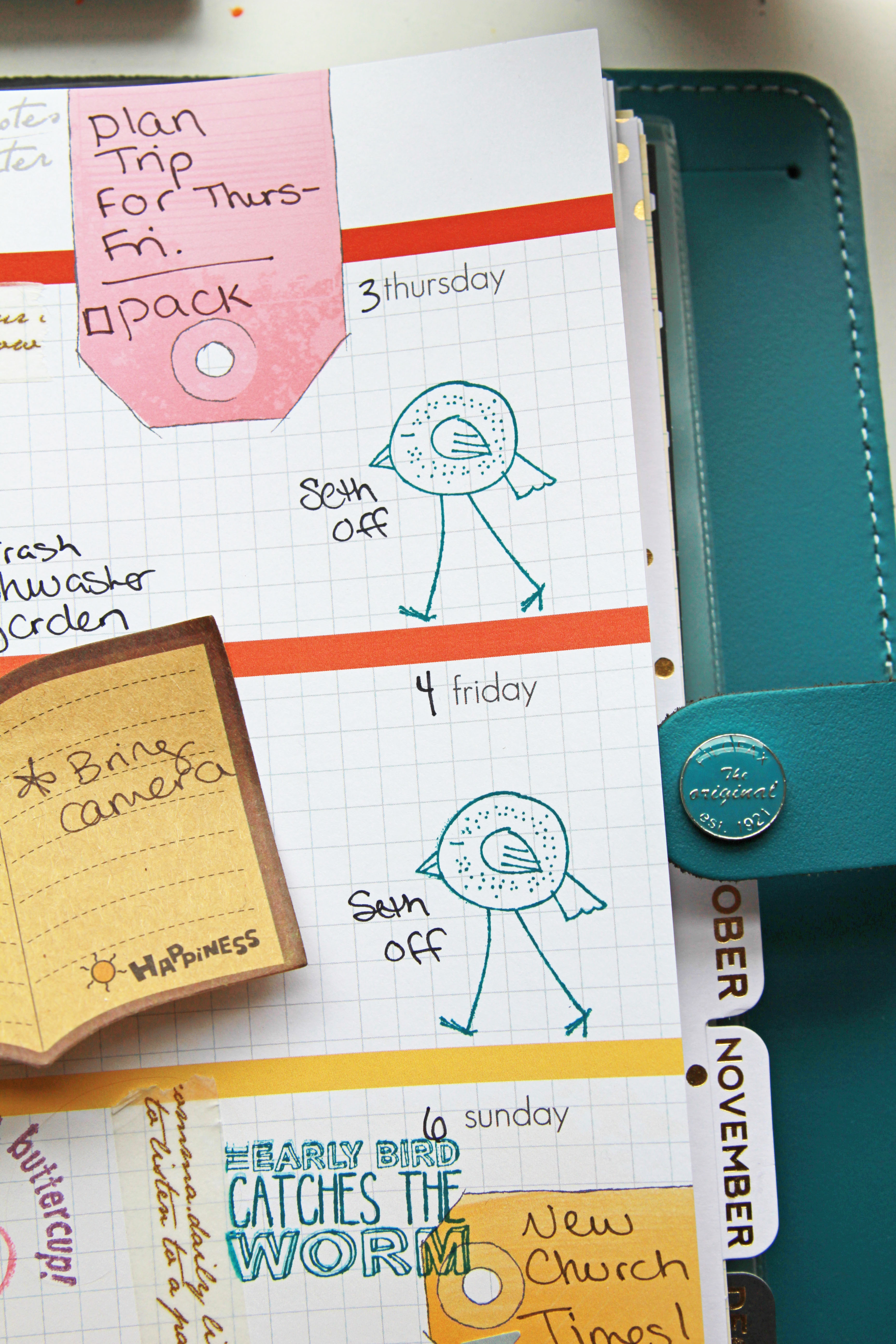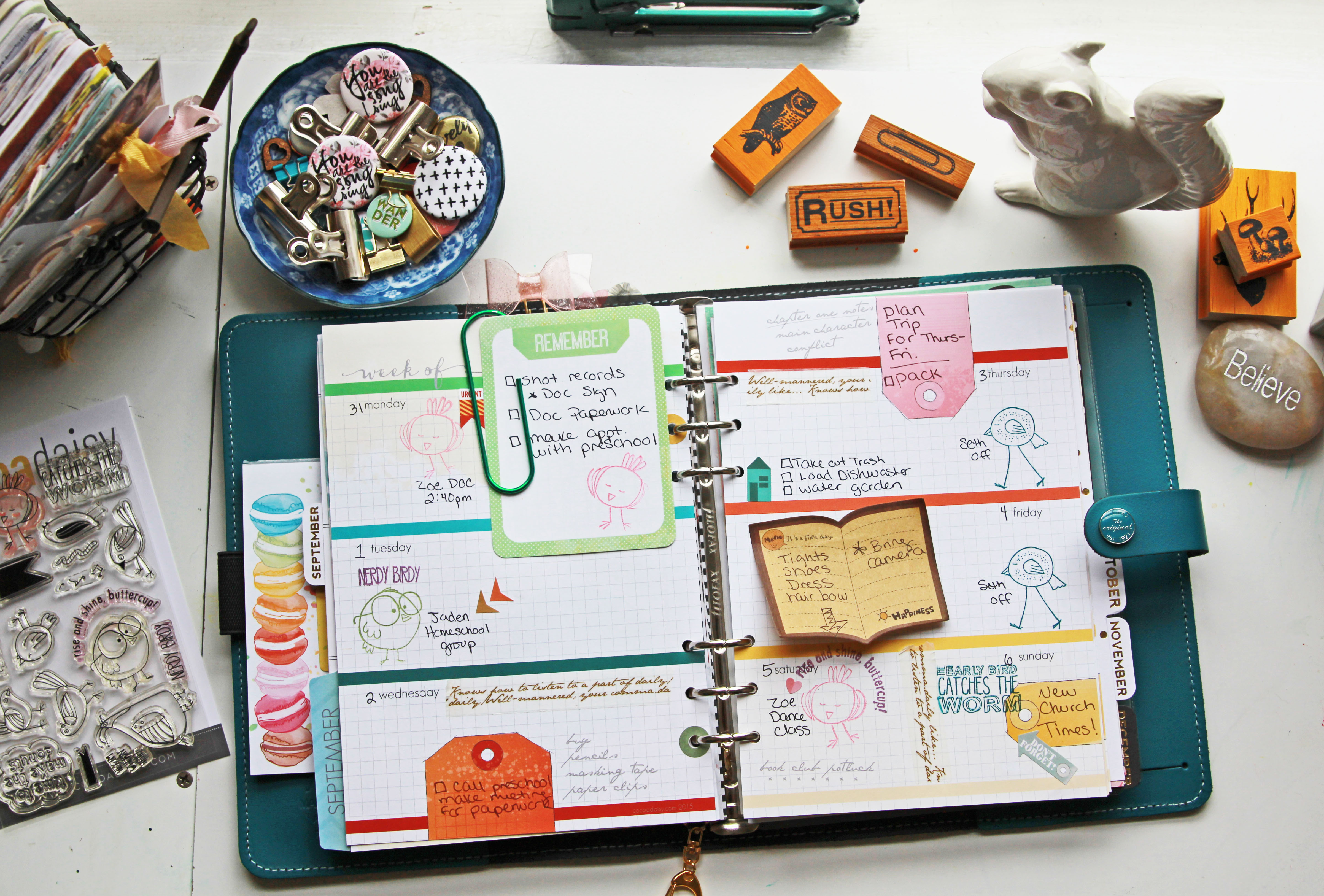 I have always color coded in my planner. It just came natural to assign the people in my life a color! Maybe it’s because my brain is very visual and seeing things stand out helps me to not forget them. It works for me and if you like color coding you will love this idea! I literally squealed when I got my August Cocoa Daisy kit and saw the cute birdie stamps. I knew I wanted to use them all over my planner. I came up with the idea to assign each of my family members a cute birdie stamp in their color. The result is a parade of colorful birdies all over my pages and it makes me ridiculously happy!