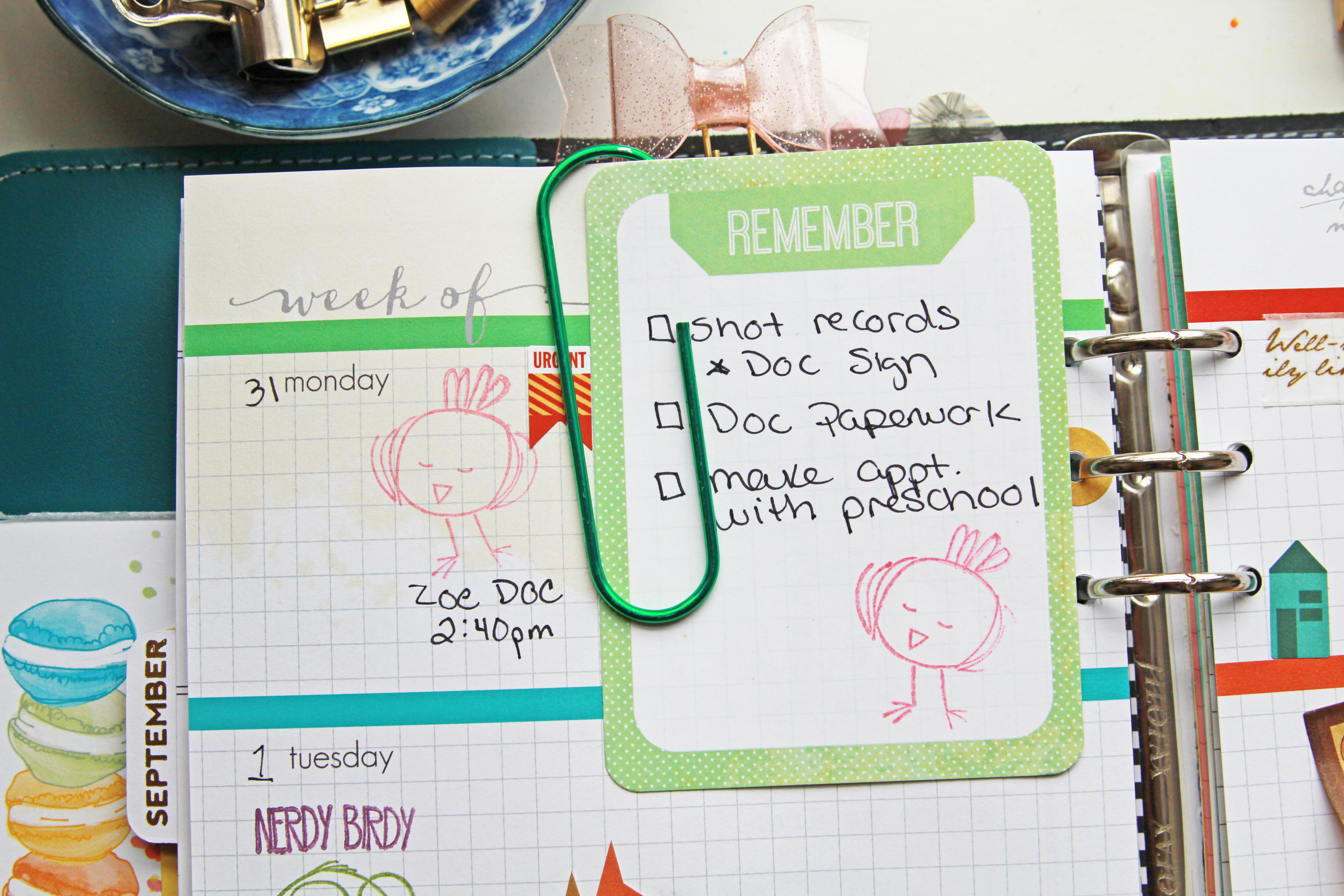 My sweet little girl is this adorable pink bird. It seemed to fit her perfectly! I love how I can quickly glance at my week and see her activities clearly.