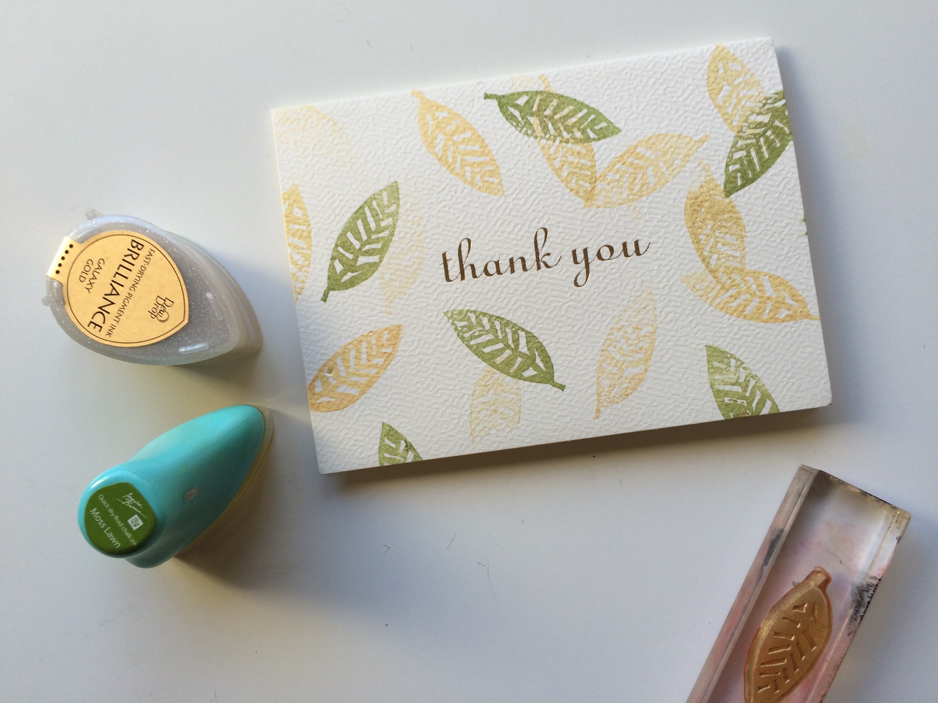 I decided to use this month’s leaf stamp with gold and moss green inks. I employed first and second generation stamping with the gold ink to give the card a textural feel and I love that there is additional texture to the green leaves due to a bit of incomplete coverage of the inks.  A very simple technique with clean + simple results!