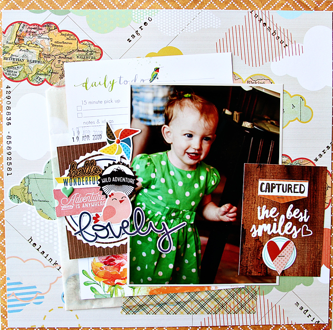 I layered up a 3×4 card with a few of the die cuts from the DITL kit to create a cute title card. I also used more die cuts and one of the exclusive cork pieces in the little embellishment cluster on the 3×4 card to the left of my photo.