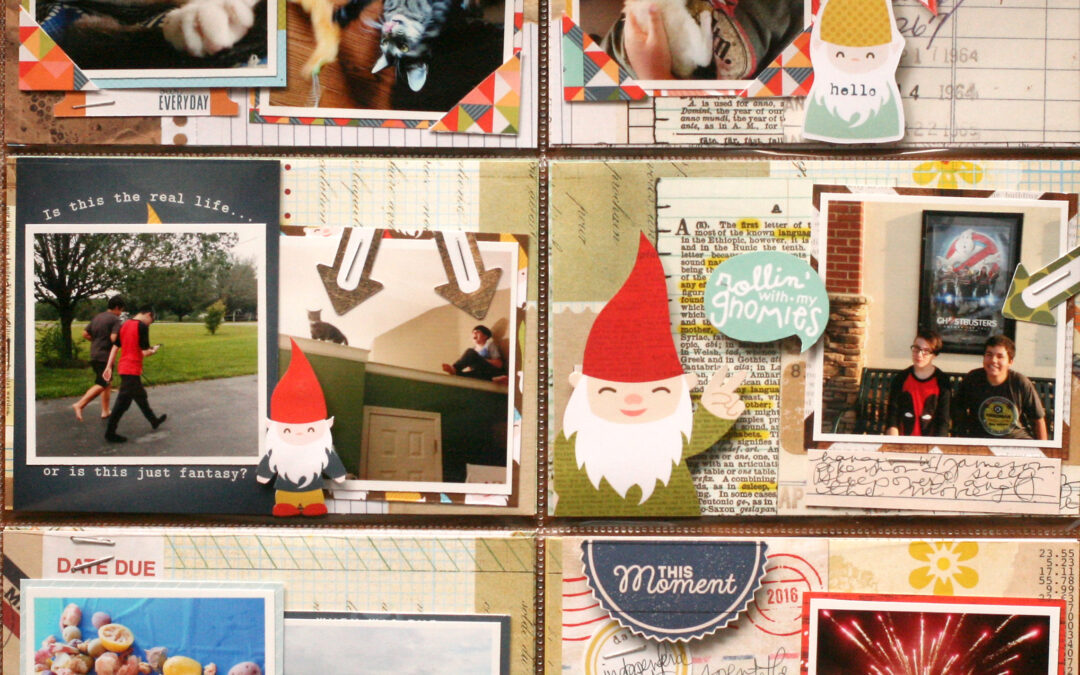 As I began to work with this month’s kit, I realized that I had a dilemma. All my photos are Instagram squares lately and I had no 4×4 pocket pages. Did I need to run out and buy those, or could I make it work? I decided to go for it, and these are the results. A couple of the photos I was able to crop to 4×6, but the rest I scrapbooked as 2×2 inch photos on 4×6 inch background papers. Each one was like a tiny scrapbook page. It worked! Happy day!