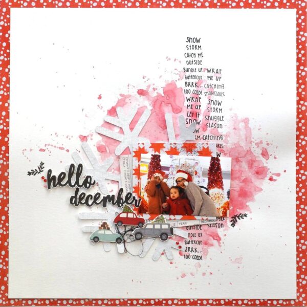 Estelle made this gorgeous winter/Christmas mixed media layout. I love the background, the layering, how she used the stamps and the fussy cut cars.