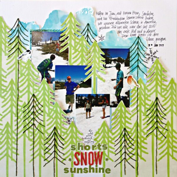 This next layout is from Simone. It is fabulous! She says: ‘Since we don’t have snowy winters here, I chose to scrapbook our very first encounter with snow since we moved here. I stitched the trees using one of them as a template. I layered some pocket cards behind the photos and then also added some mixed media.