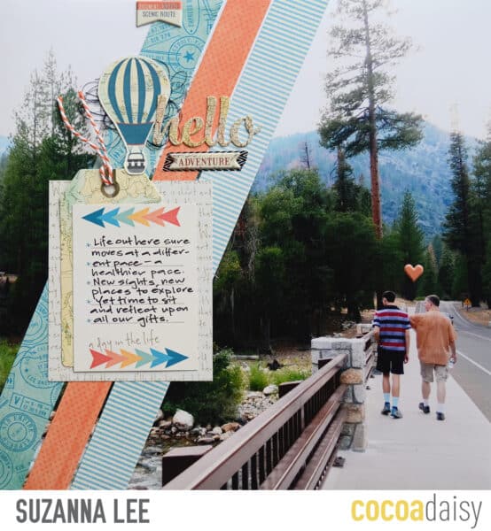 I’ll start you off with my layout! I went large! I mean, go large or go home! If you are already stepping out of your comfort zone, you might as well take a big giant leap out, don’t you think?!  I shifted the diagonal’s over to the left in order to work with the picture that I had. Because I used the large photo, I used a journal card in place of the squares and just stuck with the one thus creating a bit more balance. The lighter, ecru based elements are nicely balance with the dark shadows from the trees in the large photo. This kit is rather heavy on the ecru and lighter shades, it really needed some dark elements, such as the black washi and that bright blue for balance.