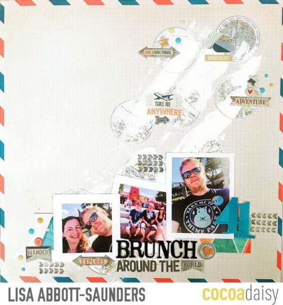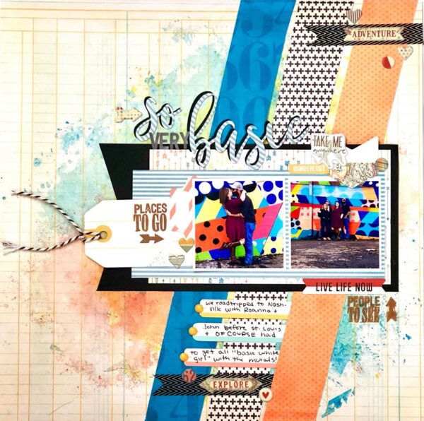 Lisa has a really great take on the sketch too! And she too uses the stamps! I love the paint brush lines as the diagonals! They definitely add some fun movement to the page! The large white mats around the photos and the white diagonals really pop the layout.