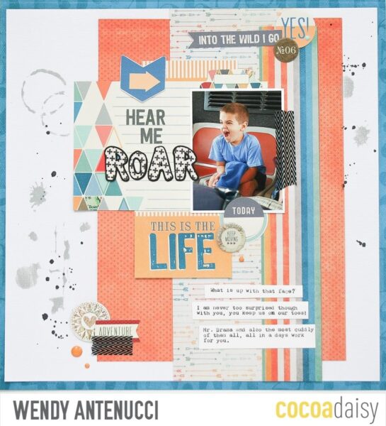 Simone too used mixed media for her layout. I love that her stripes ARE the mixed media and the rest of the layout are bits and pieces from the kit. Do you see the stamps from the kit that she included?! Here is what Simone has to say about her project; I had a hard time with the diagonal lines, I knew if I wanted to make them work, they needed to almost blend into the background. So I tried some new mists and love how it turned out. I used several layers behind my photos and added some texture with the stamps from the kit. Then I added the title using an alpha stamp set. I finished by adding three embellishment clusters. Simone also has a process video that you can find here; https://youtu.be/PSJlq0AceXY