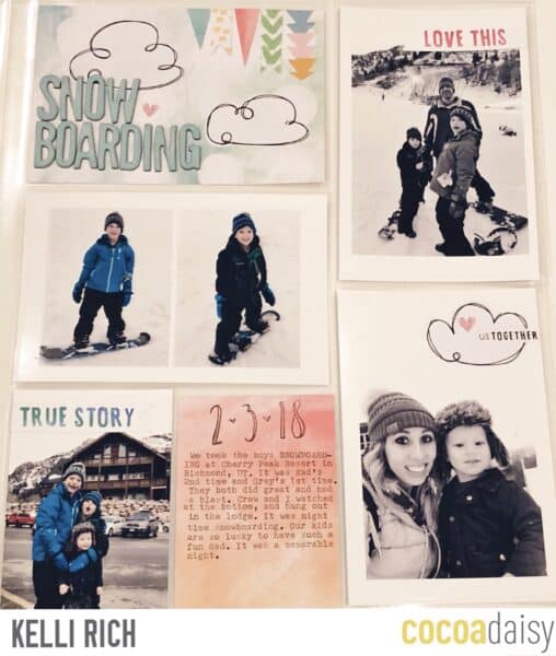 Hello! It’s Kelli here, and I’m excited to show you a layout I was inspired to create with the February Cocoa Daisy kit. I made this pocket page by adding a little bit of everything: pattern papers cut down to 4×6 and 3×4, photos, some clouds from the printable, a few scraps of paper for a banner, 2 heart stickers, word phrase embellishments , and chipboard alpha stickers. I created my own journaling cards by doing this. I also added a little something right on top of some of the photos to tie it all in together.