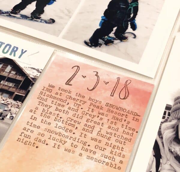Once I cut this paper down to 3×4, I used my vintage typewriter to journal about our snowboarding adventure. Thanks for joining me for inspiration Tuesday! This month’s kit was truly inspiring to me.