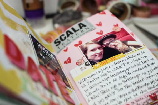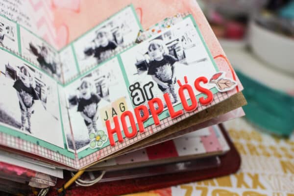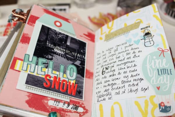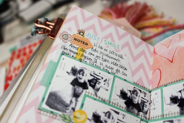The brown paperbags the classified kits comes shipped in is really nice to break the papers up a bit, it gives a different texture to the booklet that I really enjoy. Also it gives you extra pages but not a lot of bulk. What I truly appreciate with this form of memory keeping is that it doesn’t have to take a lot of time and supplies. This spread took under half an hour and I have used products mainly from the planner kits. The arrow with the flower is from the pocket memory keeping kit but I could’ve easily grabbed something else from the planner kits instead.