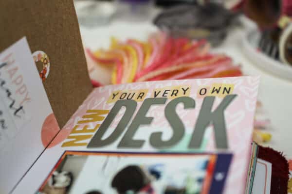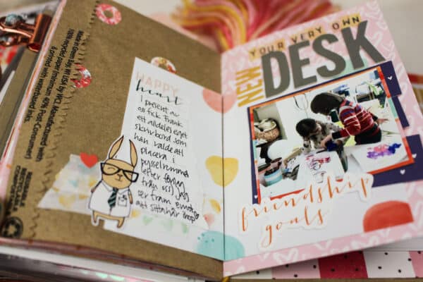 The alpha stickers in the planner add on kit are some of my favorite to use in my memory keeping, it is so fun to mix with other alphas to create longer titles like this one. And when using this format the title really becomes a huge embellishment! I think the papers from the main planner kits are made for using in your memory keeping. The paper with the huge dots on for example worked really nicely on this spread and I continued the dots to the brown paper by throwing on some of the hole re-enforcers from the main planner kit. And how could I not  add a Simon to a page about something as nerdy as getting your very first desk?