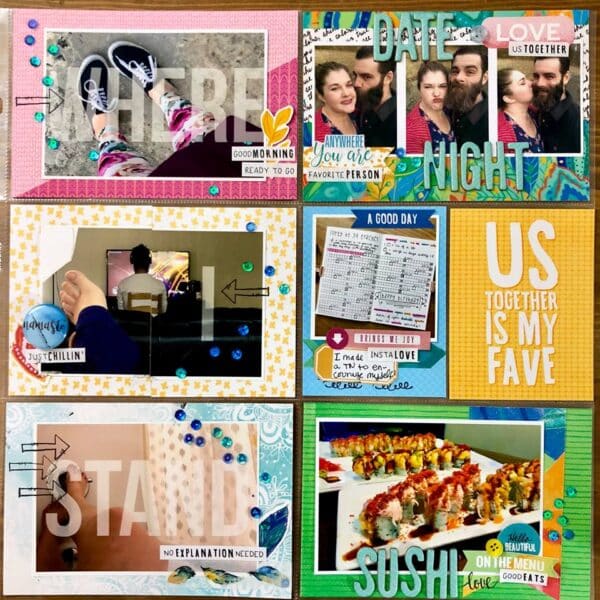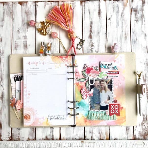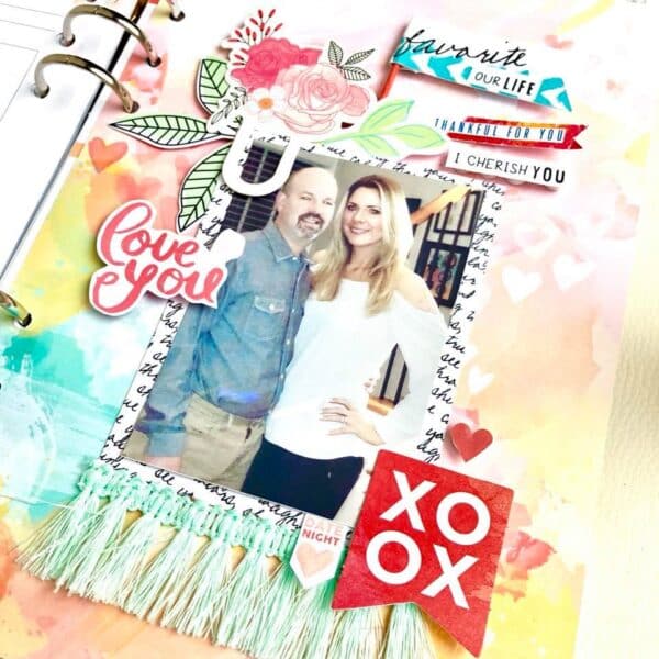 I am going out of town tomorrow for a fifth grade field trip until Friday (insert eye roll here…it’s Valentines Day people) so I wanted to put a picture in my planner of my husband and I. I used two ditl cards and a few pieces from the kit. I love how everything coordinates so well! Oh and the trim I bought today at Michaels in the clearance section.