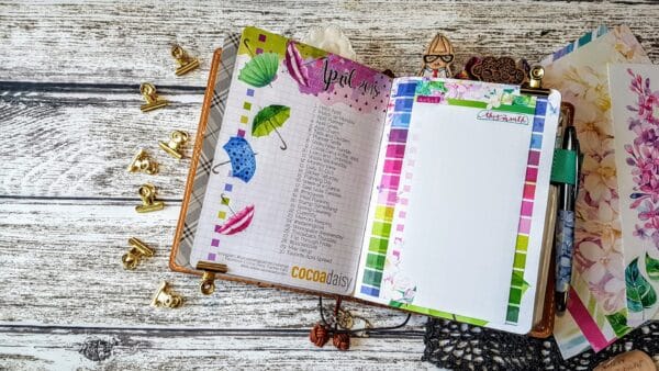 I used washi tape and adhesive to adhere the 2 page calendar to the front calendar page of my dori and made it so that it flips open and closed for easy viewing. And I am going to be using the back of the first page for April Goals and big to do’s. I also adhered the Monthly B6 size Challenge page to the inside of my front cover, these will be available for download in the Cocoa Daisy shop on Reveal Night!