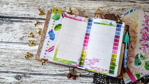 Inside my B6 Planner, I have decided to try using the Month on 2 pages as my calendar for the month. This will contain the same info as my undated dori but will be inside my dori so that when I need to look back on a particular month I only need to grab that dori, and not have to have 2 out to look at what happened. I also do this because occasionally my Undated Dori is left at home if Chris needs to see what is happening. I will be changing this to a Monday start Calendar, I just hadn’t decided how I was going to do this before filming!