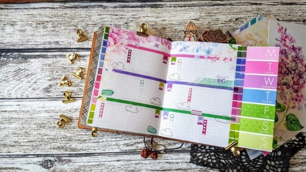 I then started to decorate my week on 2 pages spreads in the front of my dori. These grid pages are great to plan in for the month for me. Some months I change things up but the B6 planner pages give you lots of room for lists and tasks as well as decor and embellishments. I will even do some lettering in here for larger day tasks!