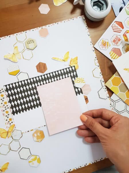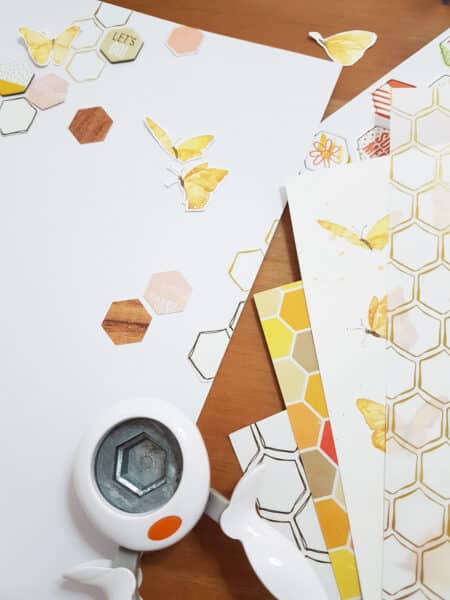 First, let’s make the background. I’m so in love with all the hexagons of July memory keeping and pocket kits, especially the fold foil vellum paper.