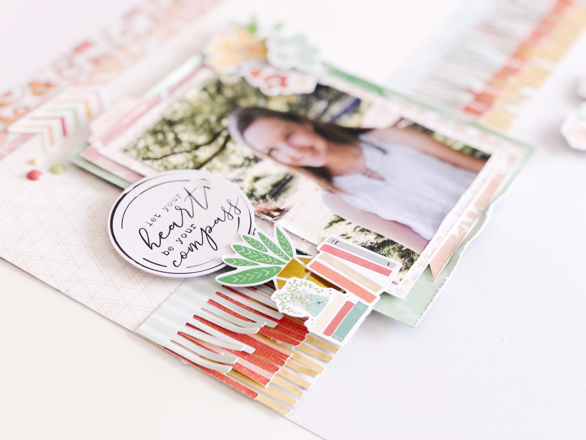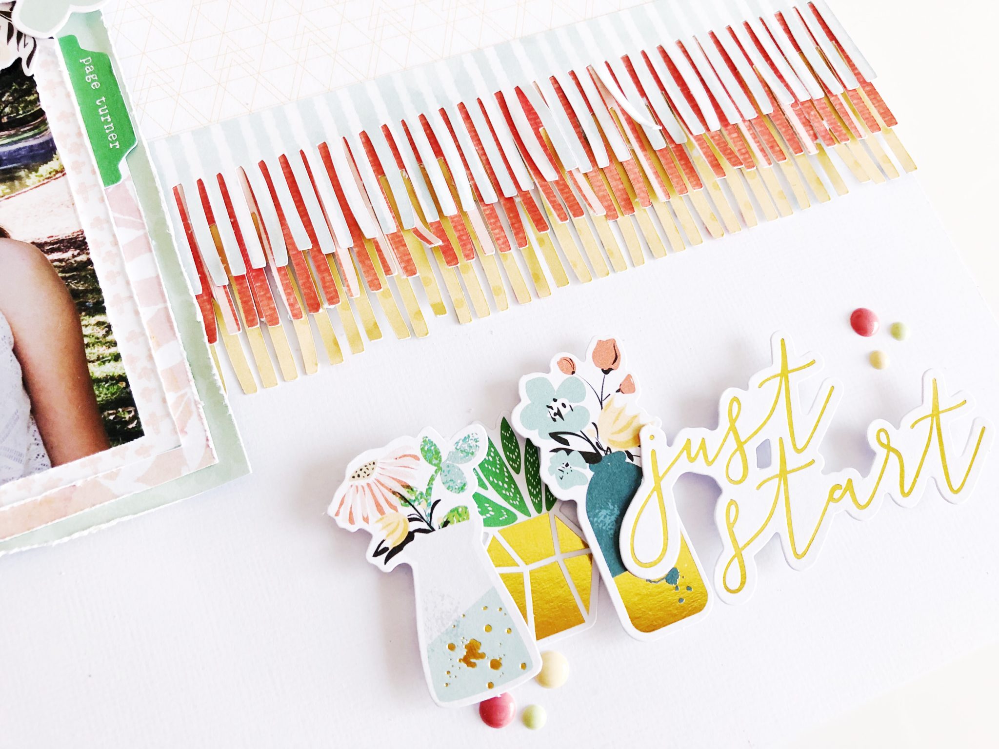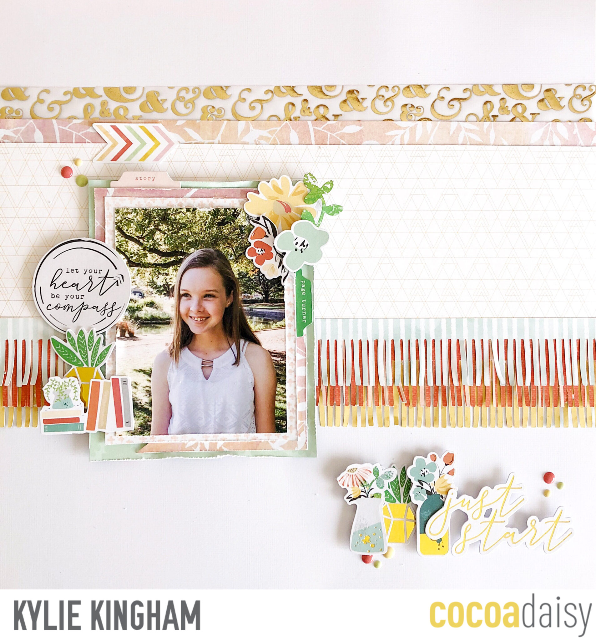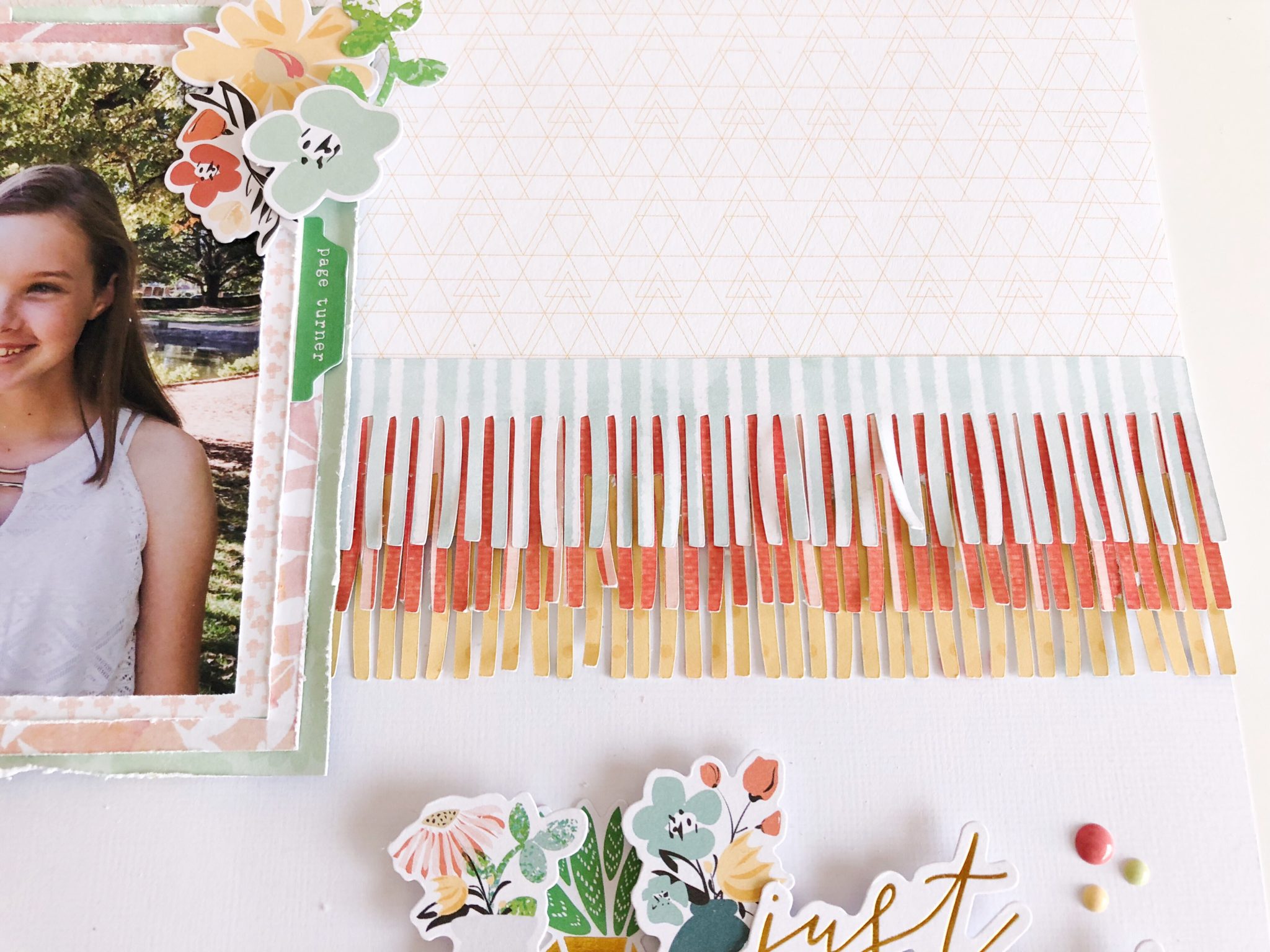 I really wanted to focus my layout on some fringed border pieces. I used my Silhouette Cameo to cut these out but you could also try these by cutting them with your scissors or I have seen before special ‘fringe’ scissors which have multiple blades.