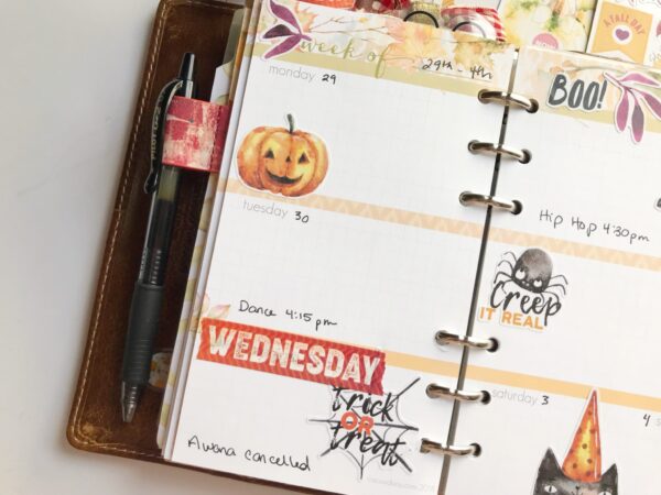 I used a little bit of the “days of the week” washi tape to emphasize Wednesday since that’s Halloween.
