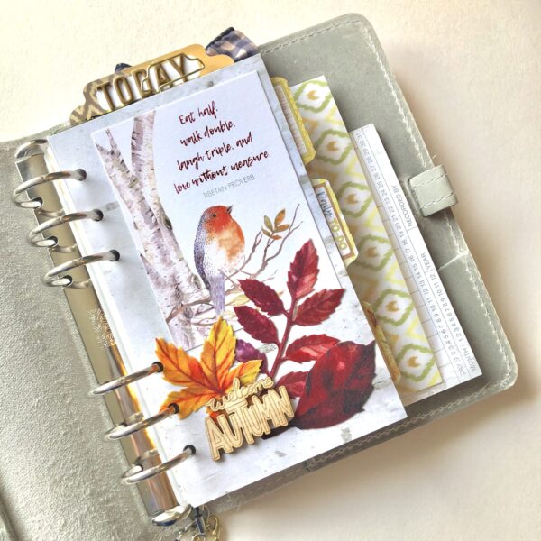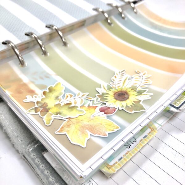 Laminated Pieces/Page Markers- Some months I take the die cuts and place them inside a laminating pouch. I play around with layering until I get a look I like, close the laminating pouch, run it through the laminator, and then trim and punch to desired size. Here’s a link to a youtube I filmed in August using the die cuts and this process. https://www.youtube.com/watch?v=miU-C41TQcc&t=2s