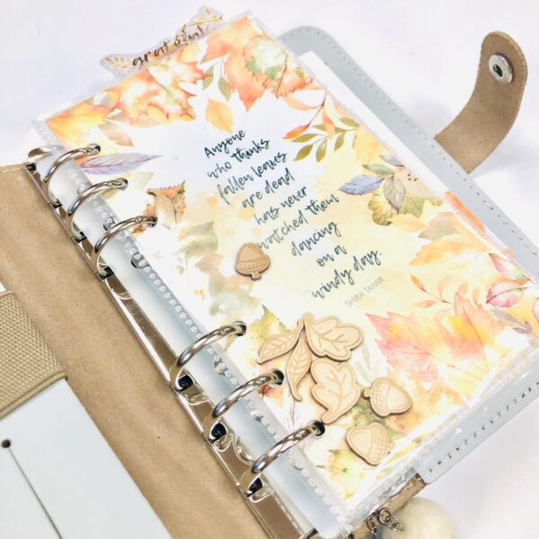 Front Covers – I took some of the paper and added a card from the pocket memory keeping kit. I then layered the fabric leaf die cuts and added a wooden piece to finish it off.