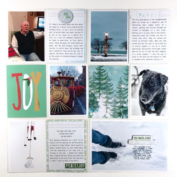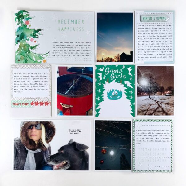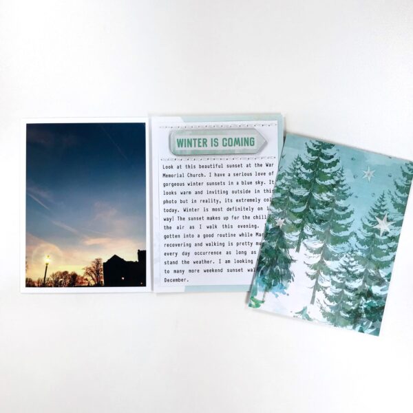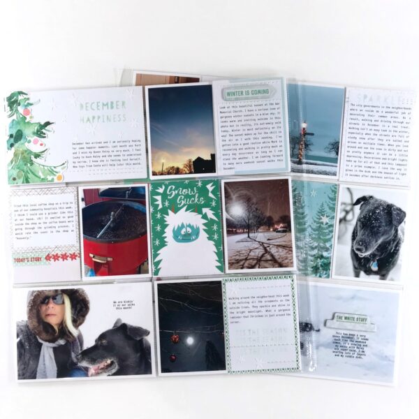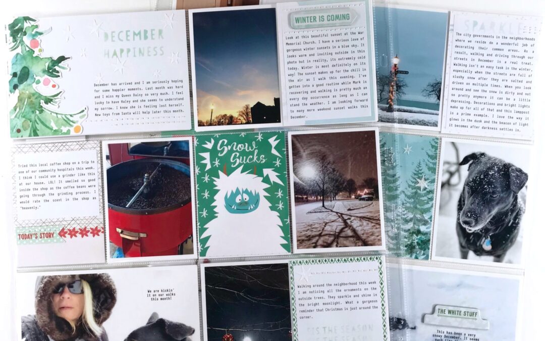 Hello Daisies! I love the beach but I love the mountains just as much. It’s the trees and the majestic views that I can actually feel in my heart and so its now surprise the tree cards and papers in the Snow Globe collection caught my attention immediately! I created a December 2017 2-page 12×12 spread based on two tree cards that inspired me, plus that adorable Abominable Snowman.