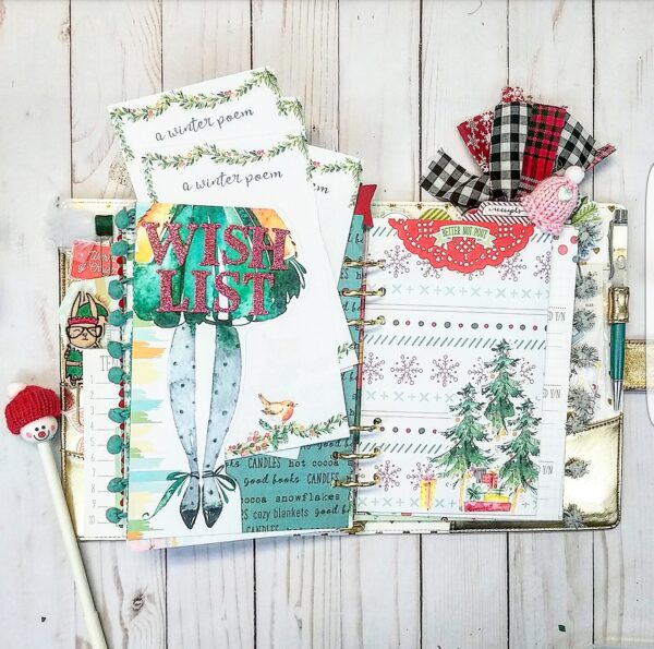 I turned the back into a folder to keep wish lists and ideas. December always comes with lots of receipts, so why not add a little envelope you got from the sweetest of sweet friends and glue a few CD die cuts and a doily on for fun and keep all of them in one safe place! You know I printed the free gift lists and added them in here too!!