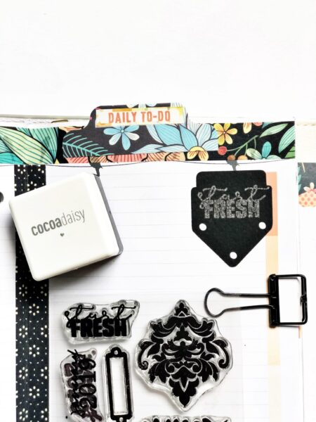 The retro tabs and the silver ink are a perfect pair. I used this one as sort of an arrow pointing to the words that will be written below, a gentle reminder that each day is an opportunity to start fresh.