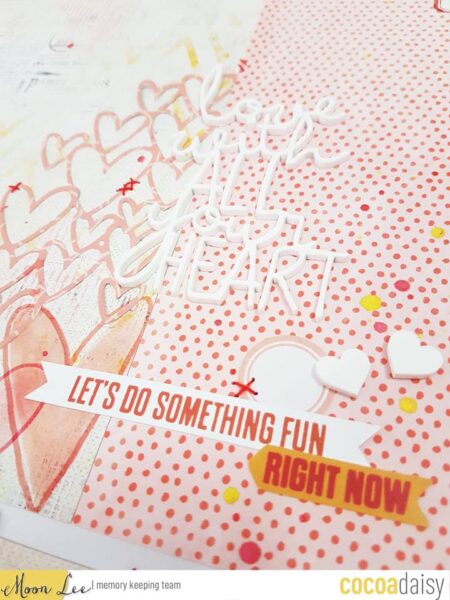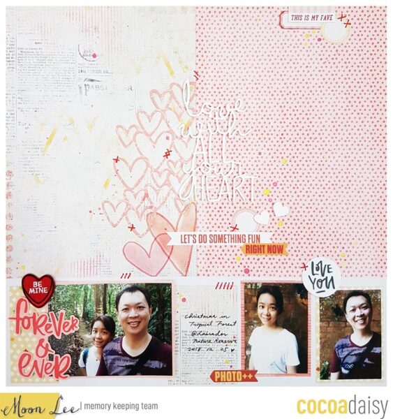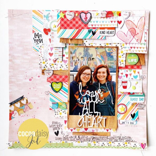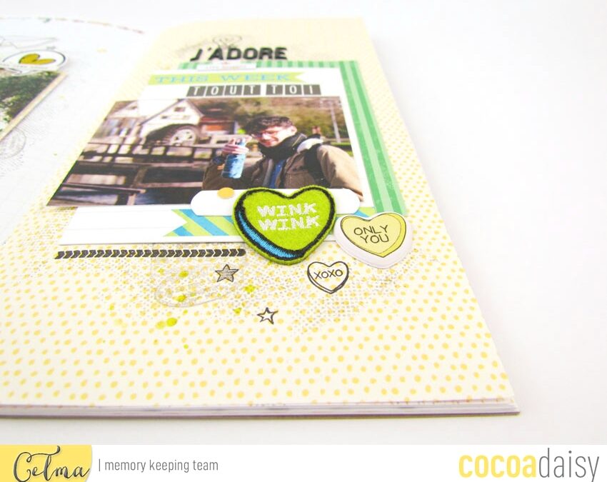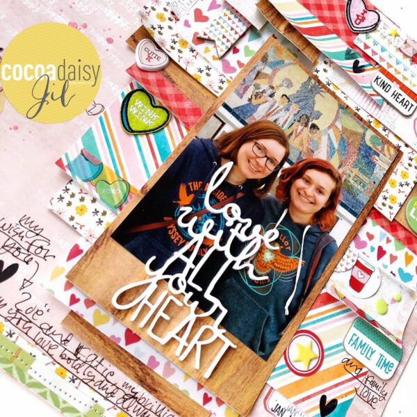 It’s so hard to pick up just one item as my favorite, so waht I tried to do is to use what I love from the kits for my 12″x12″ layout. The acrylic title and the embroidered heart are definitely the top two of my favorites!