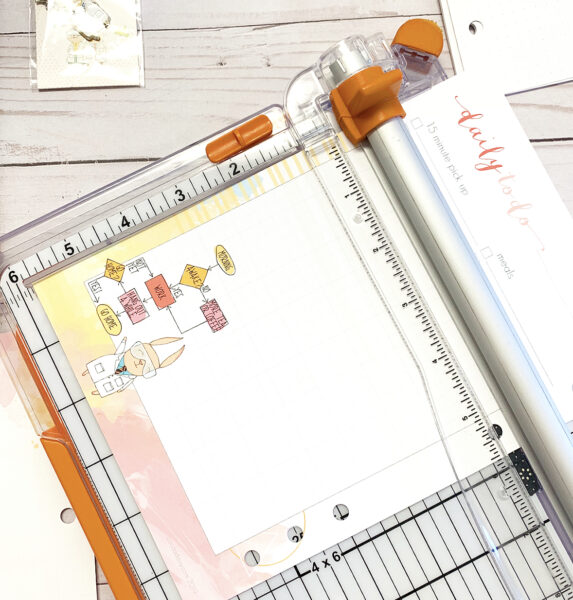 The way I cut the inserts changes a little every month because of the adorable graphics that I can’t part with! Here is a picture to show you exactly where I cut the daily and the week on one inserts.