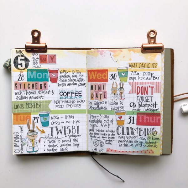 I couldn’t wait to start using my February Planner kits with Simon and Betty so I took one of the spreads from the Mini Daisy Dori and glued it into my traveler’s notebook for the last days of January. That worked out perfectly because I then was able to flip the page.
