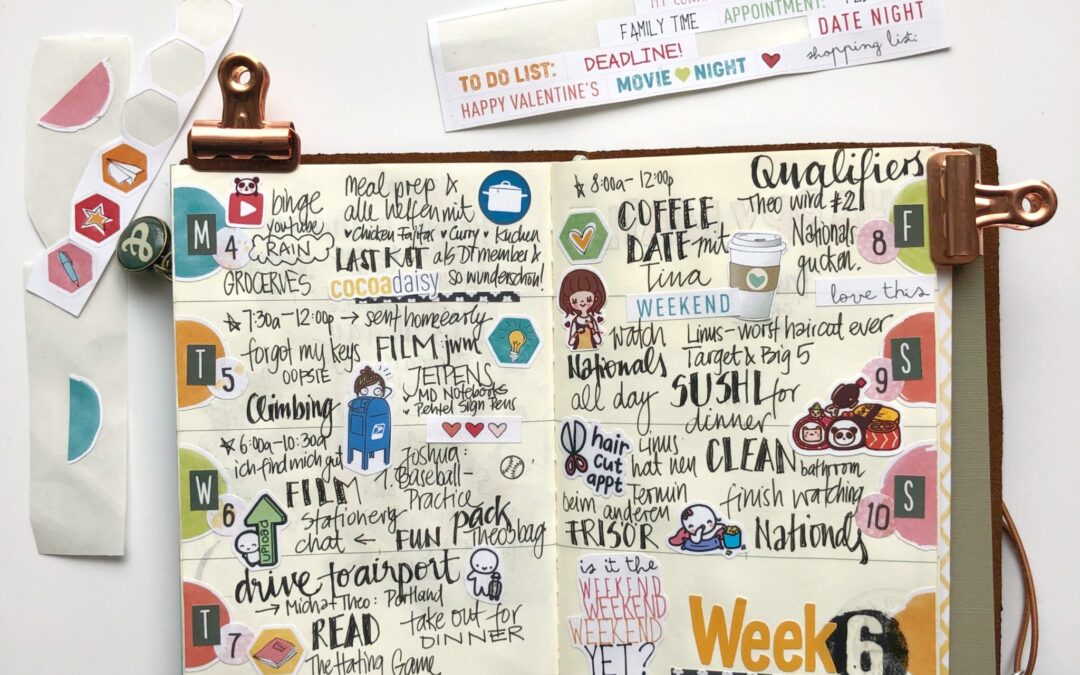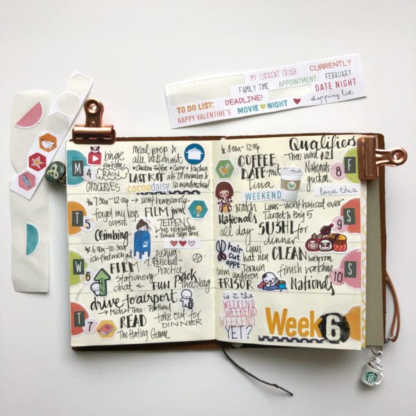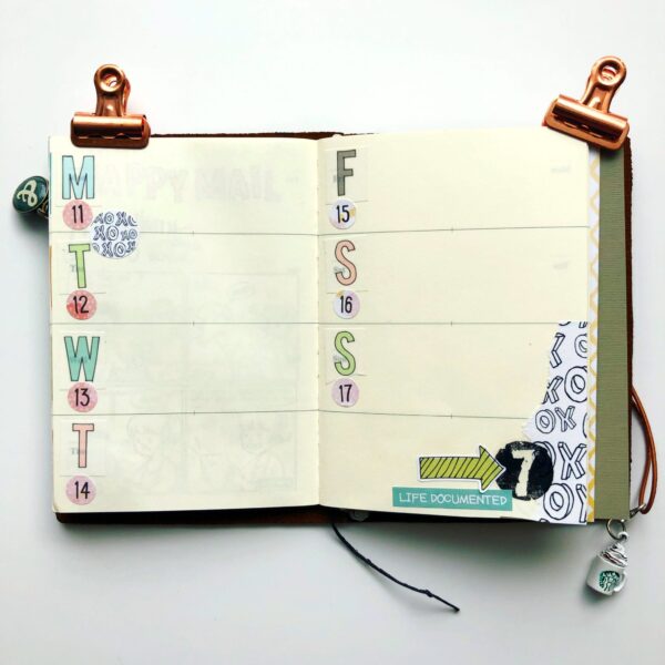 I’ve been using a weekly traveler’s notebook insert to do some happy memory keeping spreads using stickers, hand lettering, stamps and ephemera. I call it logbook because I sit down every night (ideally, every 3-4 nights realistically) to log my days in this format.