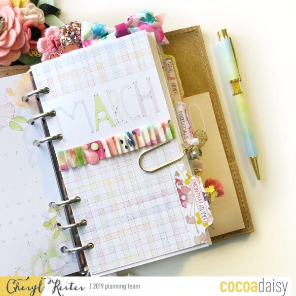 This is a glimpse of the laminated vellum pocket for the stickers as well as another divider for my March goals.