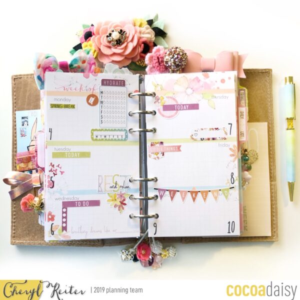 Here is just one week but I have the entire month set up and I keep my extra stickers with me in case I want to add something more.  I created both a vellum page holder and a laminated card holder that you can see in my video included below that holds my extra stickers.