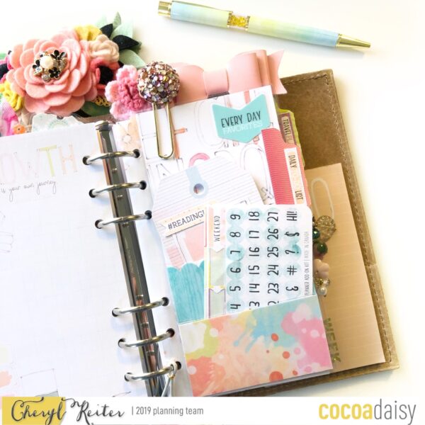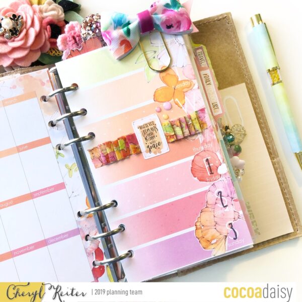 I always use the dashboard subscription – it makes it so easy to create simple and beautiful dashboards! Here I simply added a washi ribbon ruffle and the enamel dots. This is my divider for my month at a glance.