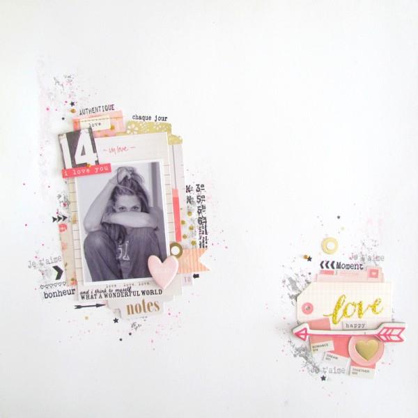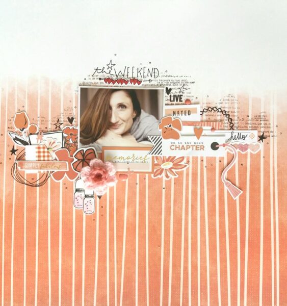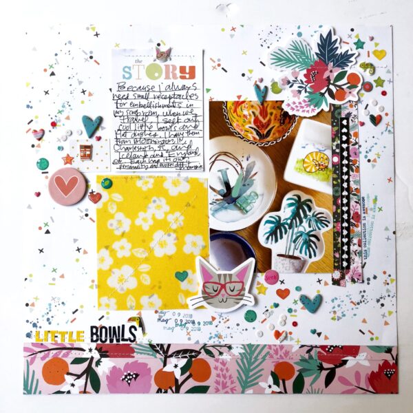 This close-up shows how this no-photo layout takes a sentiment sticker as its focal point, keeping the design and spirit of the original while creating something entirely new. And here is a 12×12 page that Celine herself took as her inspiration: