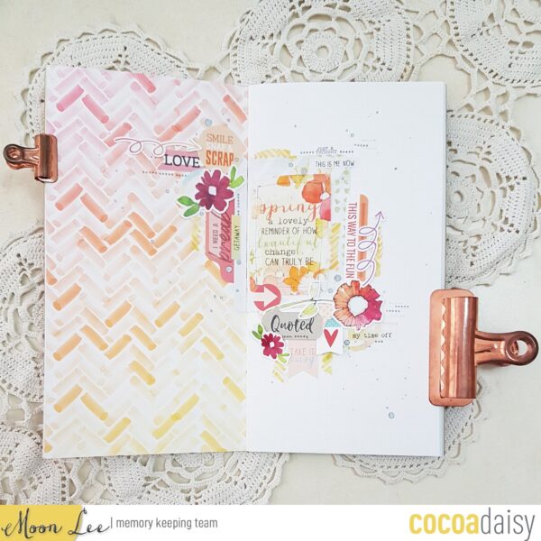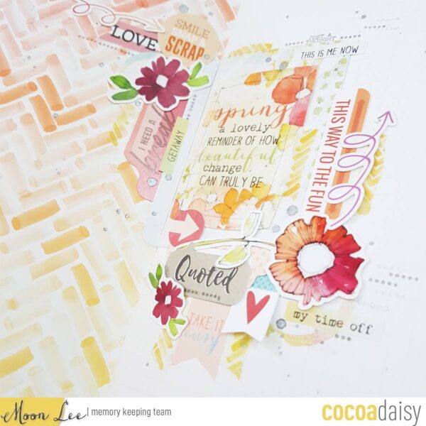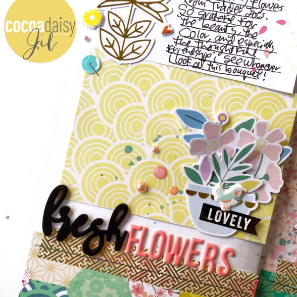 Moon is using the Fresh Cut kit here so beautifully! Just as the 12X12 does, her design draws on clustered embellishments and pretty floral details along with text.