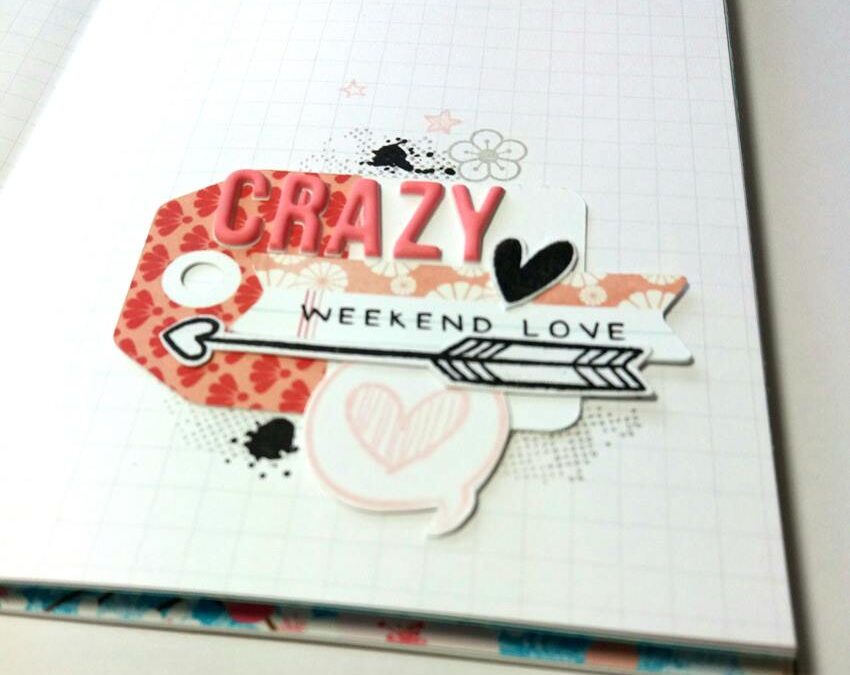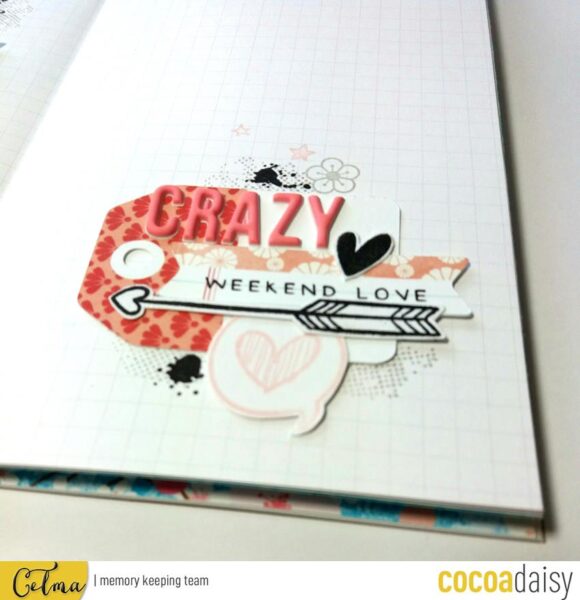 Here she is working with the Cherish Blossoms kit, and I love all the white space combined with the great coral pink from the kit. The arrow and cute paper airplane veneer, combined with color and style, link the two clusters and make the page cohesive. Celine does an amazing job of showing how embellishment clusters on 12X12 pages can work on a smaller scale on notebook pages.