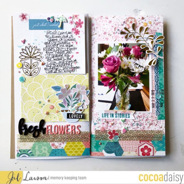 This detail shot shows how to build a title from the script foam words and the coral alphabet from the Memory Keeping kit. The pot of flowers is made from three layered die cuts and it reinforces my subject, a bouquet of flowers from a friend. I hope these translations have given you some great ideas for taking inspiration from your favorite 12X12 pages and using the Travelers Notebook kit to bring them to life in a new way!