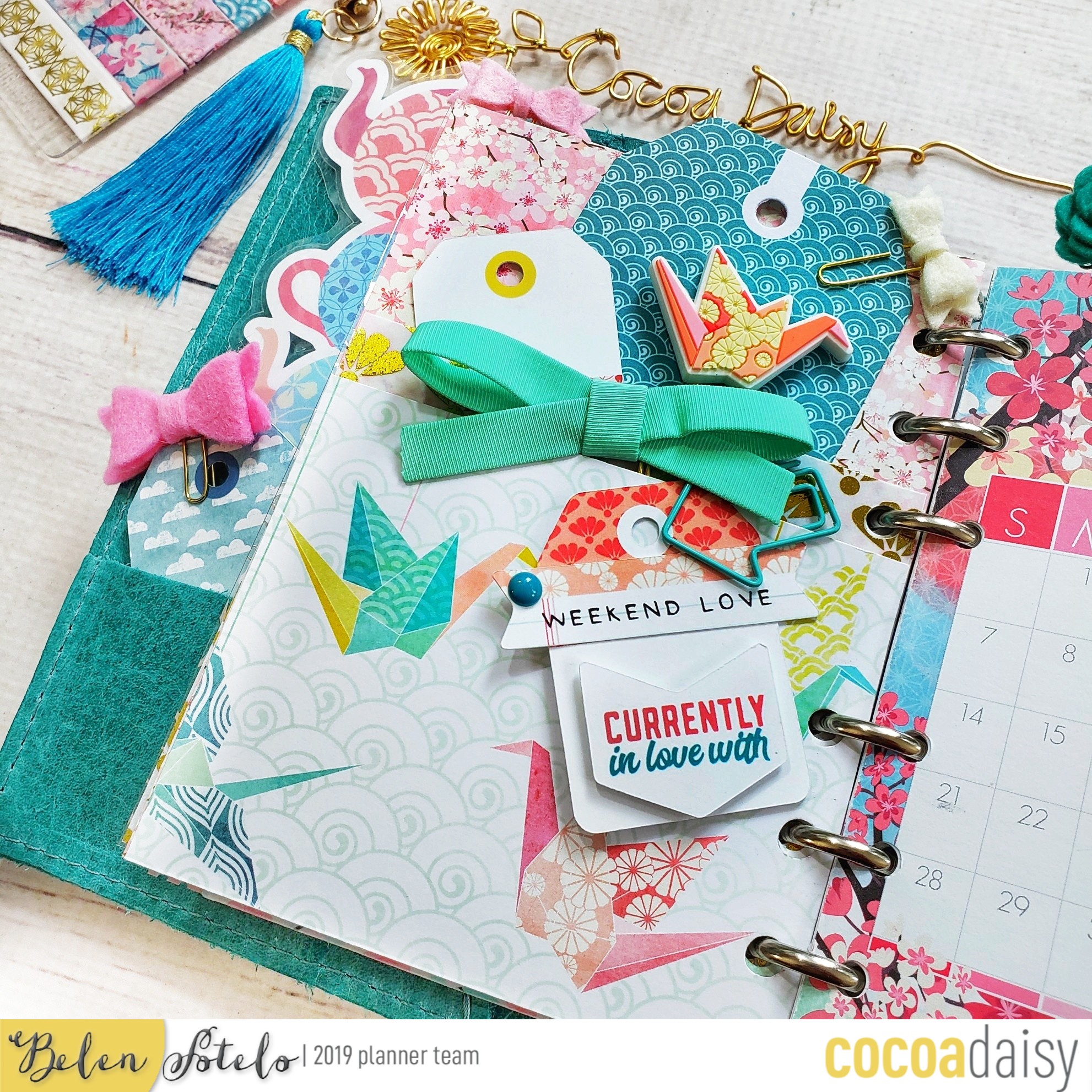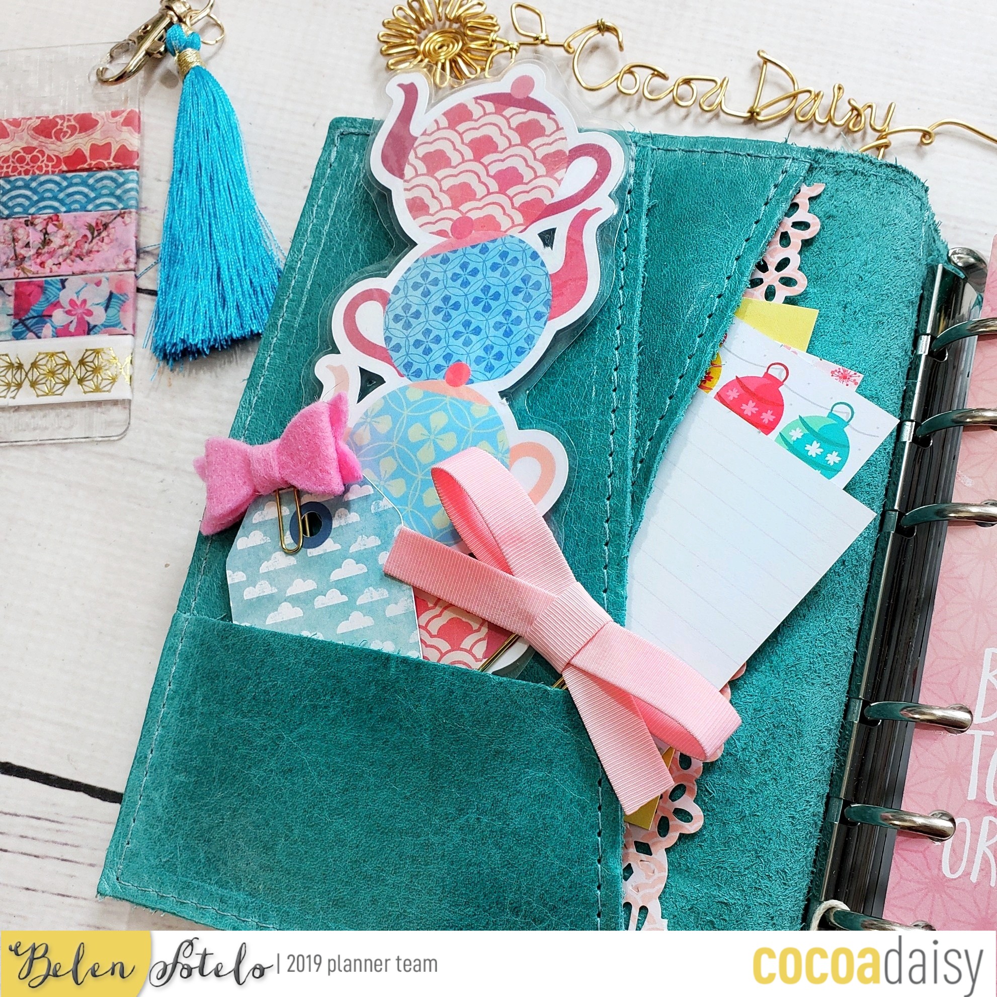 For the month of April I’m using an A6 rings planner. The first thing I do is add some planner pretties to my pockets. Here I added a bookmark that I made with the free planner printables and my Silhouette machine. i also added a tag and some bows that I had on hand.