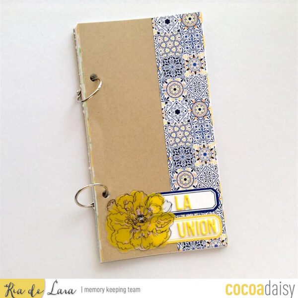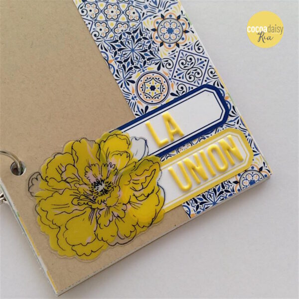 I trimmed this lovely patterned paper and attached it to the side of my dori. Then, I attached 2 label stickers which I used to hold the title of my album. I finished it off with a clear yellow flower which came from the Lemon Grove Classified Memory Keeping kit. So excited to scrap now.