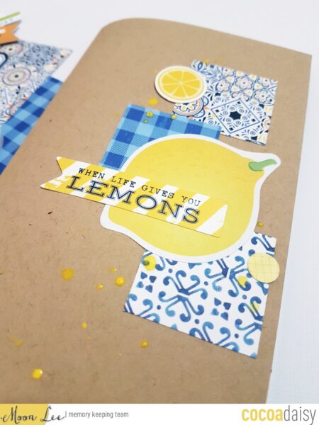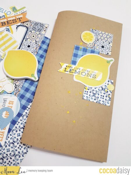 Moon and I worked with the Lemon Grove kit to make our latest Simple Dori Covers. Here’s what she said about her work: “I really love the color combo of yellow and blue! The lemon sticky notes are super cute, too!!” I totally agree!!