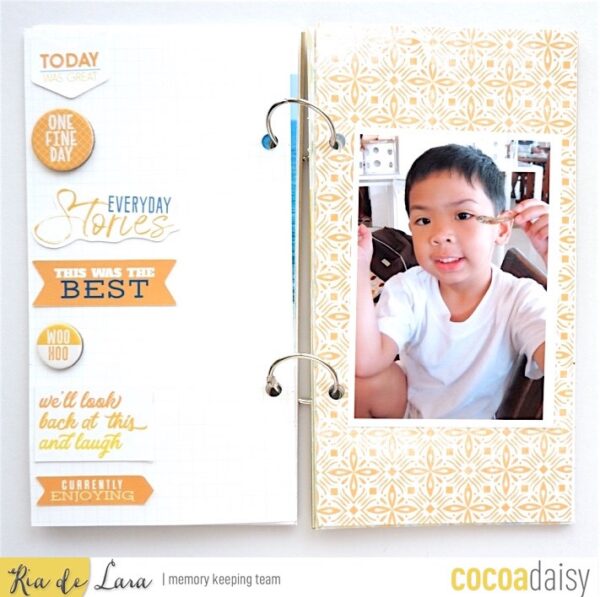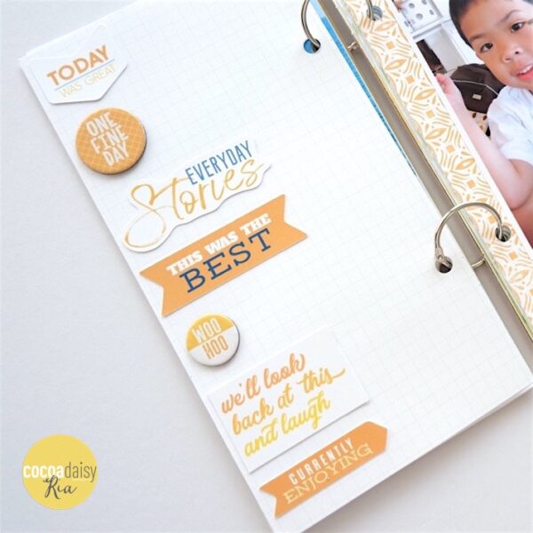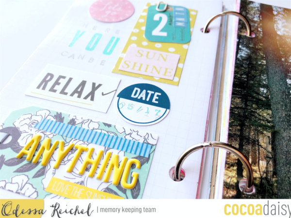 I also used the grid paper to line up my embellishments. I made an organized arrangement of various embellishments, stickers, alpha stickers, stamping, die cuts and paper clips, on the left side using the grid paper in the Traveler’s Notebook as my guide. On the right side I inserted a full page photo. The nice thing about converting my Traveler’s Notebook to work on loose binder rings is that it’s so easy to add things in (and get a little heavy handed with chunky embellishments!)