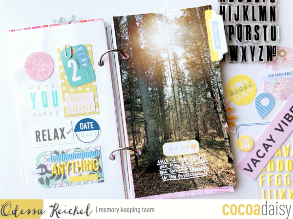 The large photo did not need much embellishing but I tied it together with the left side of the layout with a cute tab from one of the Lemon Grove kits with a phrase sticker from the Memory Keeping Sticker Subscription. You can also see the alpha stamp set I used from the Lemon Grover Traveler’s Notebook kit, it’s such a nice basic font to use in layouts!