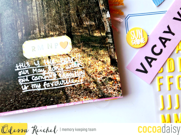 I sat down with my kits and started pulling out all the embellishments that felt like they gelled with my photo from a recent camping trip. It was all about relaxing and warm sunshine so there was a lot of great stuff to chose from in the kits. I used embellishments from all of the Lemon Grove Memory Keeping kits including the Classified Kit which I always look so forward to every month. It always has the perfect extra touches. I like to add lyrics to layouts often so I snuck some in here with the stamping and those awesome yellow puffy alpha stickers.