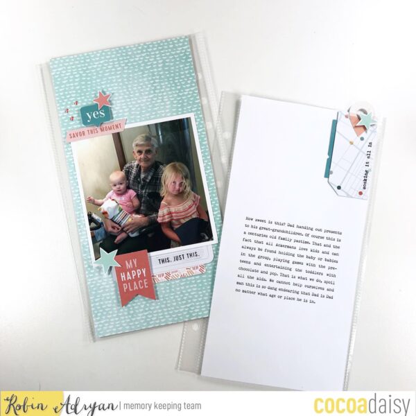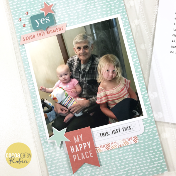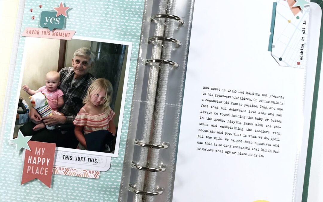 On the blog today some of my favorite designer peeps and I are going to show you how we used the classified memory keeping kit in our latest designs. Moon designed a sweet cover for her travelers notebook and Odessa’s pocket pages documenting a recent camping trip are awesome! I have a photo of my dad with his great granddaughters that is priceless and needed to have a special place in his birthday album.