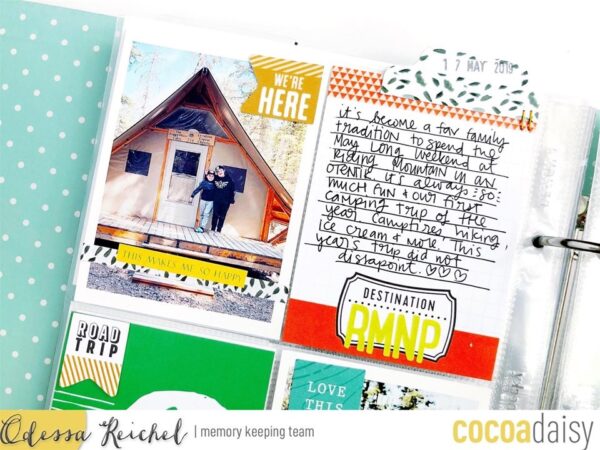 Odessa noted, “That National Parks one was on point for our trip to Riding Mountain National Park. I used a ton of the Pinkfresh Embelishments on my layout along with some of the Memory Keeping Pocket cards – they are so cute this month!”